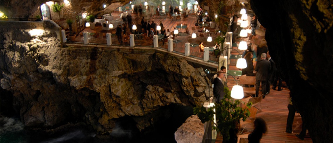 Nad Adriatykiem, na południu, w miejscu, gdzie obcas łączy się z włoską cholewką, trochę w dół od Bari, leży Polignano a Mare. Sama nazwa bajeczna, ale bajek jest tam więcej. Jedną z nich jest hotel Grotta Palazzese z restauracją wykutą w grocie właśnie. Jadąc banałem (ale inaczej się nie da) – jest uroczo, cudownie, romantycznie i pięknie. Jest. Szczególnie wieczorem i szczególnie między majem a październikiem, bo tylko wtedy jaskinia, w której karmią bardzo przyzwoicie, jest otwarta dla głodnych i spragnionych pocztówek z romantycznych wakacji. Grota, jak to grota, nie jest niczym nowym, a korzystano z niej już w XVIII wieku. Można się domyślić, że robiła takie samo wrażenie na przybyłych, jakie robi dziś. Ale wyobrażacie sobie coś fajniejszego niż dźwięk fal roztrzaskujących się na kamiennych ścianach, bryzę, którą ze sobą niosą? Do tego wino i menu degustacyjne z lokalnimi przysmakami i owocami morza. Żeby dojść do restauracji trzeba pokonać wykuty na klifie most. Cóż za emocje!